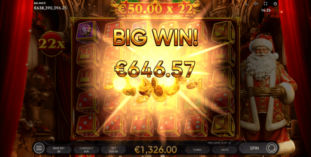 Die Grafik ist hochwertig mit intensiven Rot-, Gold- und Grüntönen. Der Soundtrack ist fröhliche Weihnachtsmusik mit königlichem Touch. Endorphina setzt auf die moderne Cascade-Mechanik: Gewinnsymbole verschwinden mit spektakulären Animationen, neue Symbole fallen nach, und Multiplikatoren leuchten auf. Das 6×5-Format bietet mehr Raum für Cascades und Multi-Win-Kombinationen. Das Design ist mobil-optimiert.